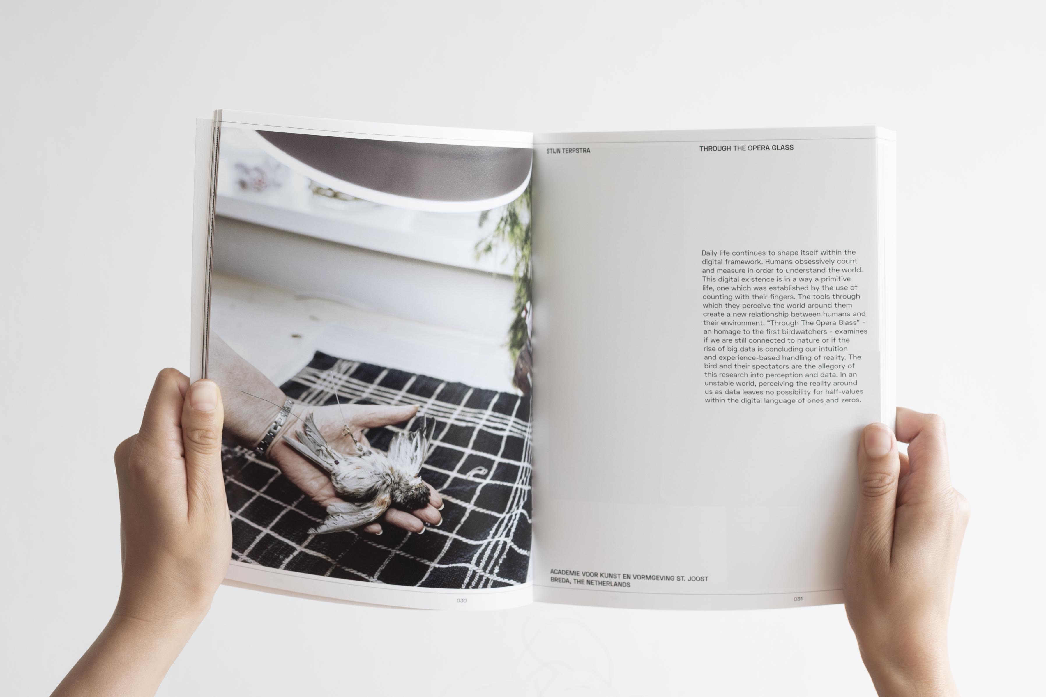We obsessively count and measure in order to better understand the world. This digital existence is in a way a primitive life, which was established by counting with our fingers. Daily life continues to shape itself within a digital framework. Over time, we have made more tools that make us see the world in a data-centric way, changing how we use our instincts and experiences to understand reality. Through the Opera Glass, a title referencing the first birdwatchers’ guide, symbolizes a shift from traditional observation to modern data collection methods. The collection of photographs, data visualizations, and found footage, visually explore ways in which birds can be translated into data and used as a source of information. The bird, a symbol of freedom, and its observer represent a larger story; the paradoxical interconnection between technology and nature, where the boundaries between observing, monitoring, and voyeurism are blurred. The project follows different stages in the lifecycle of birds, from breeding to death, including their immortalization as stuffed animals. Subjects of the images include bird species collection, behavioral research, webcam and GPS tracking, and genomics-based breeding. In the installation, a live printer outputs real-time information about observed birds with coordinates, species, spotter details, and often a small anecdote.